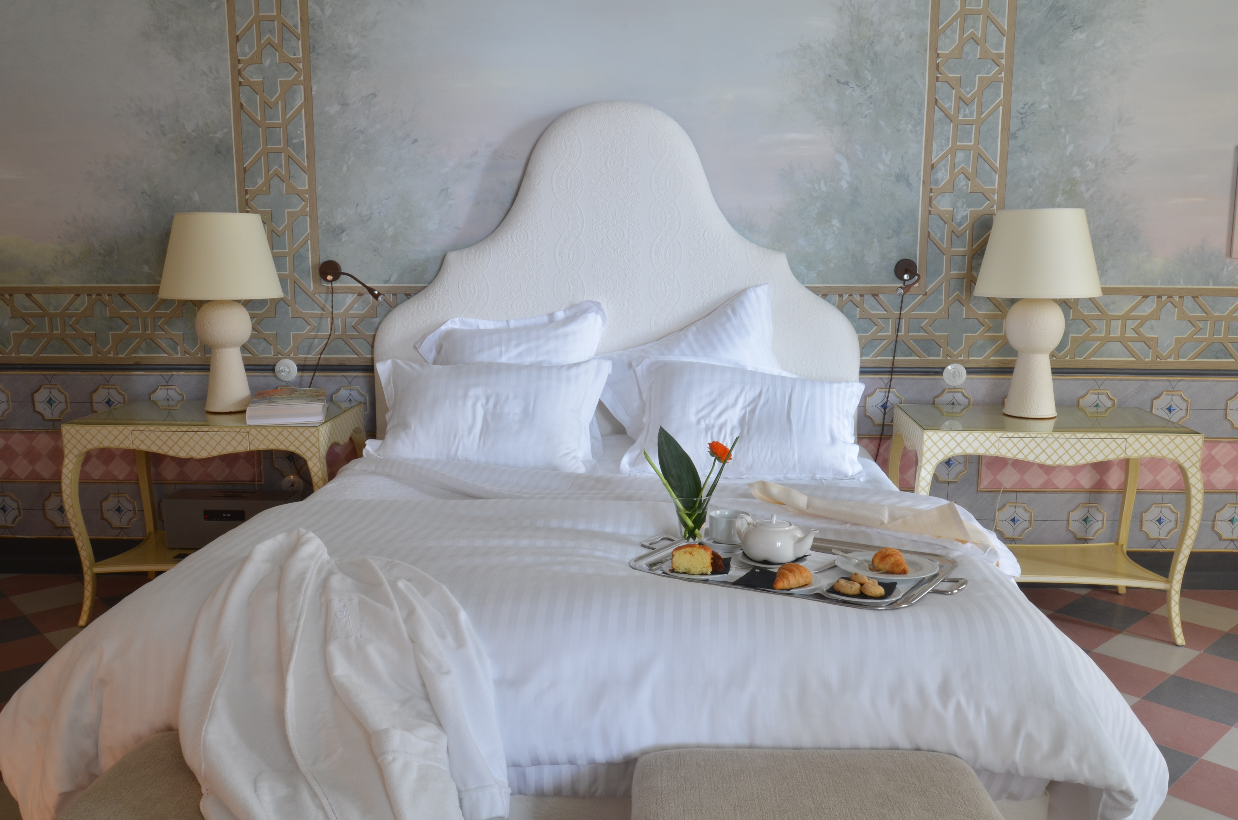 Pour celle du maître de maison, Jacques Grange a voulu une touche orientale, avec des fresques, une cheminée et une tête de lit qui nous font traverser la Méditerranée, Hommage subtil à Maria Zasa, la grand-mère du réalisateur qui était née à Tunis. Pour la chambre de Sofia, l’ambiance est cette fois romantique et féminine, avec un
