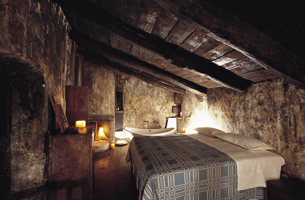 Côté saveurs, la locanda Sotto gli Archi n’a recours qu’aux produits locaux : l’épeautre, les pois chiches ainsi qu’une va¬riété de lentilles protégée par Slow Food. Le chef collabore avec une ethnologue du Musée des Abruzzes, Annunziata Taraschi, qui, dans les villages alentour, collecte les recettes et les tours de main de cette culture orale et pastorale. Ont ainsi été sauvés de l’oubli les gnocchetti aux haricots blancs servis le 24 décembre ! Dans la salle du petit-déjeuner située dans le Palazzo delle Loggette, une desserte en bois supporte quelques tasses et un thermos à café aux lignes design. Au mur, des traces noires de sédimentation de graisse indiquent qu’on y a fait séché, depuis toujours, les tomes de pecorino. Sur ce point, la brochure de Sextantio précise : « La conservation inclut la rétention des traces de vie sédimentées dans les enduits, dans les stratifications des bâtiments [et] renvoient au destin de pauvreté des populations de montagne des Apennins. »
