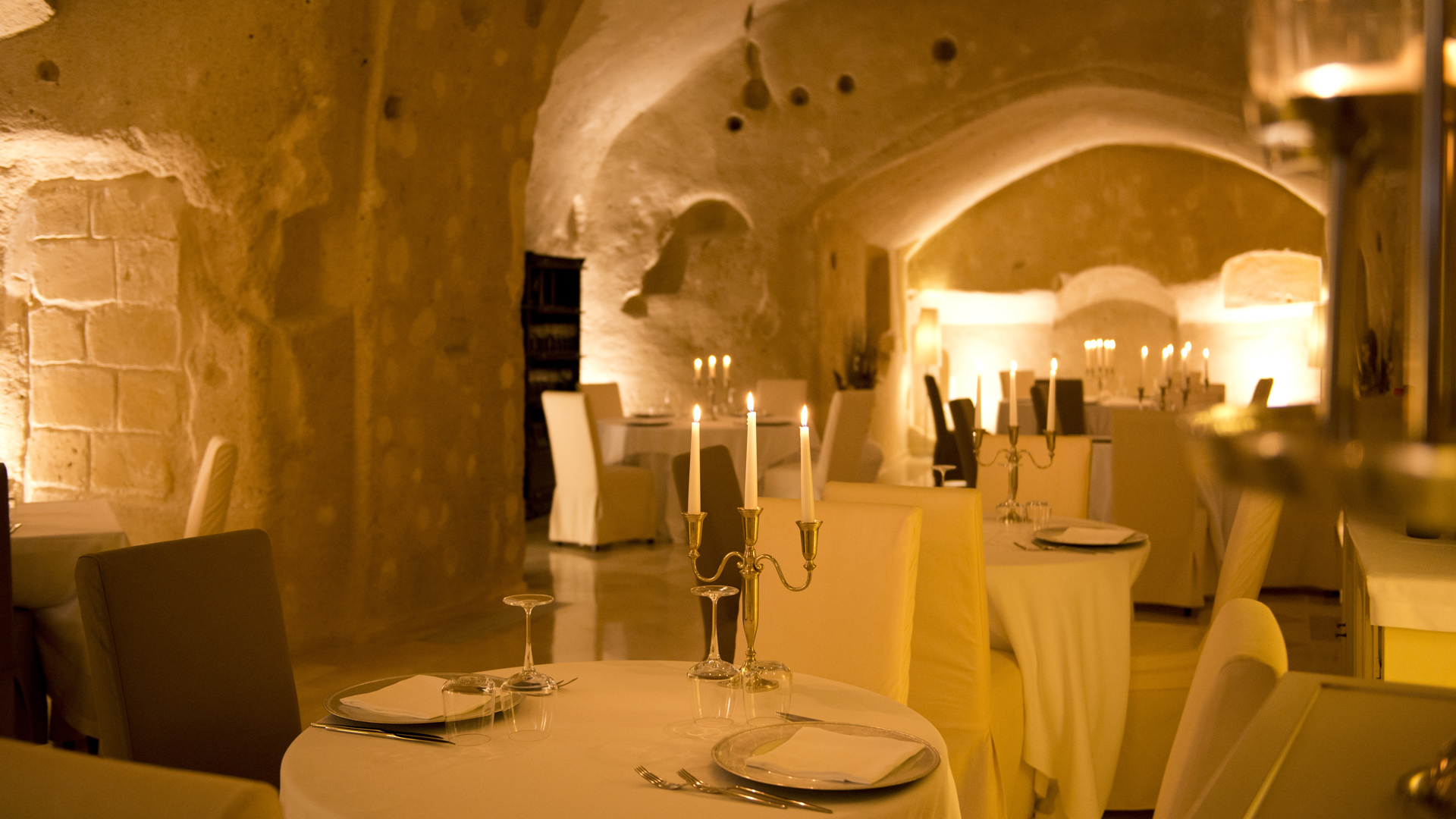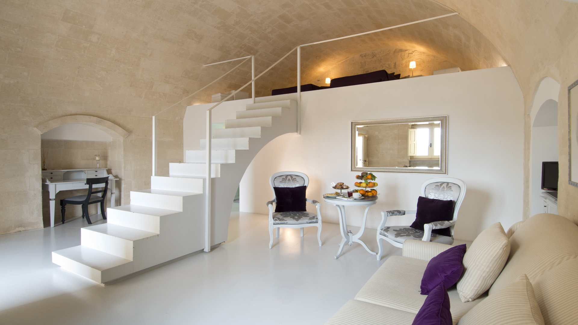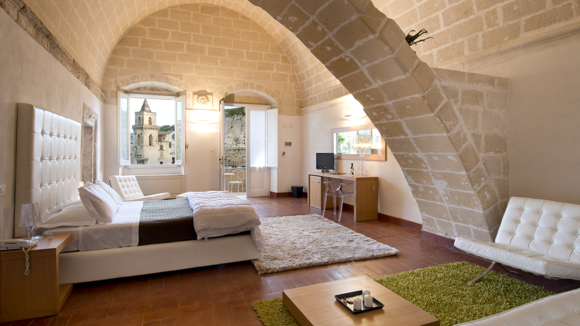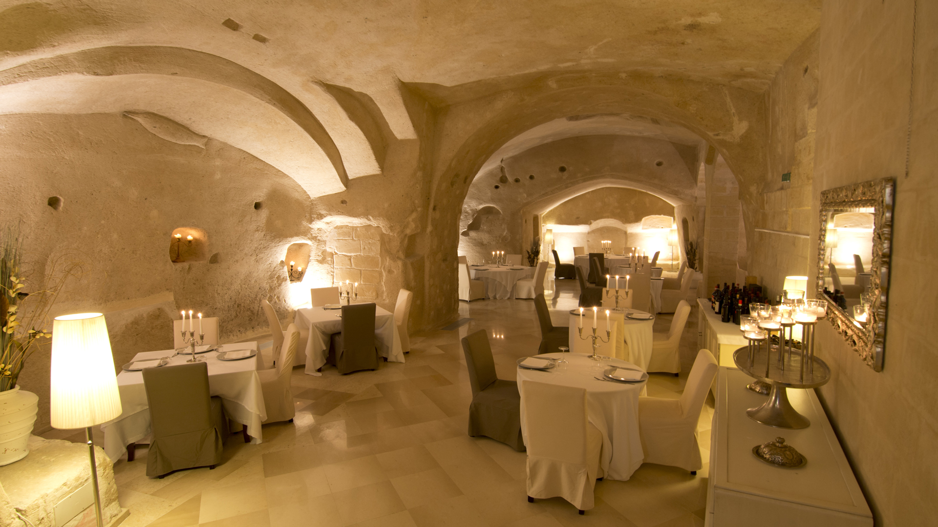 Le Sant’Angelo Luxury Resort est un hôtel diffus qui se développe autour d’un corps central, une décision dictée par le désir de préserver la beauté du paysage. Deux charmantes arcades et une terrasse panoramique sur la Piazza San Pietro Caveoso entourent le resort et les chambres se rejoignent à travers une série de ruelles, d’escaliers et des cours qui sont devenus une partie du style éco chic qui caractérise la structure entière. Un travail de restauration minutieuse, à faible impact sur l’environnement, a exalté les parois rocheuses de tuf, qui abrite un décor élégant et un jeu de lumière diffuse et enveloppant.Chambres
